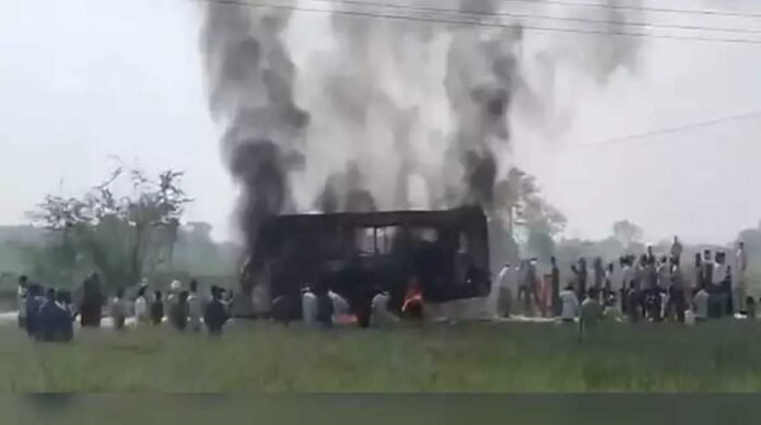 बताया जा रहा है कि बस चालक बस को नहर पटरी के रास्ते से घुमाकर मंदिर पर ले जाने लगा। इस बीच रास्ते में लटक रहे 11 हजार वॉट क तार से बस छू गई। देखते ही देखते बस आग का गोला बन गई। आग इतनी भयावह थी कि कोई भी इसे बुझाने के लिए बस के करीब जाने की हिम्मत नहीं जुटा सका। जलती बस के अंदर कई यात्री फंस गए। पीड़ितों में बच्चे भी शामिल हैं. घटना की सूचना मिलते ही पुलिस व प्रशासनिक अधिकारी मौके पर पहुंच गए।