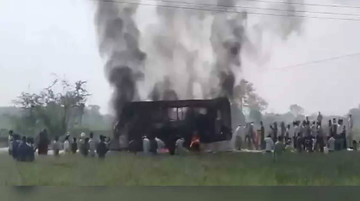 शादी की खुशियों के बीच मातम की खबर आ रही है। जहां देश में शादियों की धूम है वहीं बड़े हादसे की खबर आ रही है। बताया जा रहा है कि उत्तर प्रदेश के गाजीपुर में एक यात्री बस में आग लगने से बड़ा हादसा हो गया। 11 हजार वोल्ट के हाईटेंशन तार को छू जाने से बस में आग लग गई। आग लगते ही बस धूं-धूं कर जलने लगी। इस आग की चपेट में कई यात्री आ गए। जिससे मौके पर चीख-पुकार मच गई। अभी तक 5 लोगों की मौत हो चुकी है। मृतकों की संख्या बढ़ने की आशंका है।
