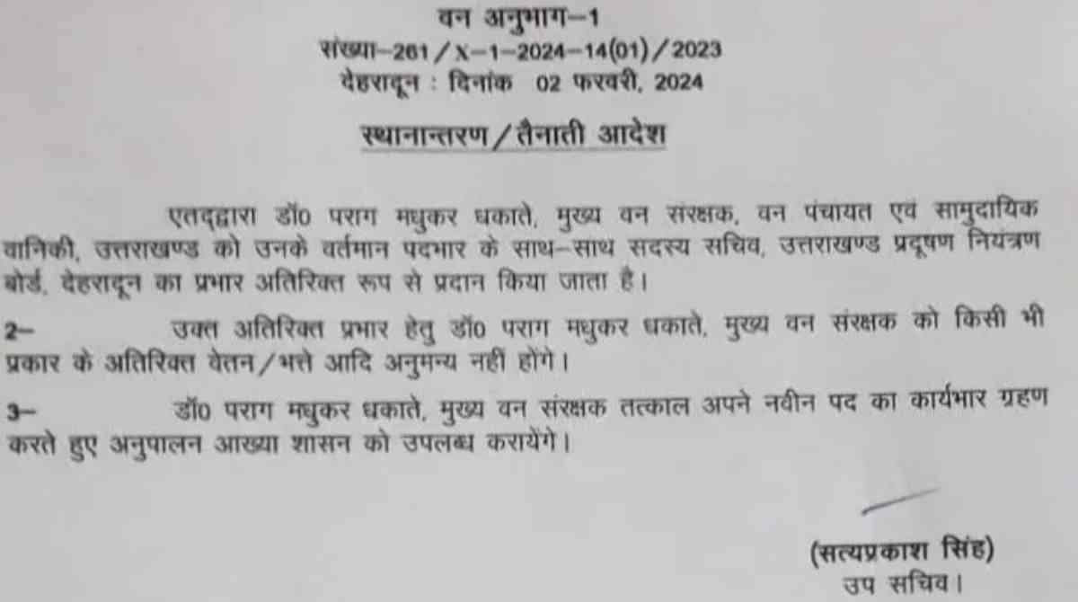 बता दें कि डॉ धकाते वर्तमान में मुख्य वन संरक्षक का कार्यभार के साथ साथ वन पंचायत एवं सामुदायिक वानिकी की जिम्मेदारी भी संभाल रहे हैं। डॉ० पराग मधुकर धकाते अपने नए पद का कार्यभार ग्रहण करते हुए शासन को अनुपालन आख्या उपलब्ध करायेंगे।