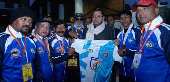 मुख्यमंत्री पुष्कर सिंह धामी ने शाम मुख्यमंत्री आवास स्थित मुख्य सेवक सदन में इंटरनेशनल फुटबाल प्रतियोगिता में प्रतिभाग करने वाले 24 खिलाड़ियों और खेलो मास्टर्स नेशनल फुटबाल प्रतियोगिता-2023 में कांस्य पदक जीतने पर 75 खिलाड़ियों को सम्मानित किया।